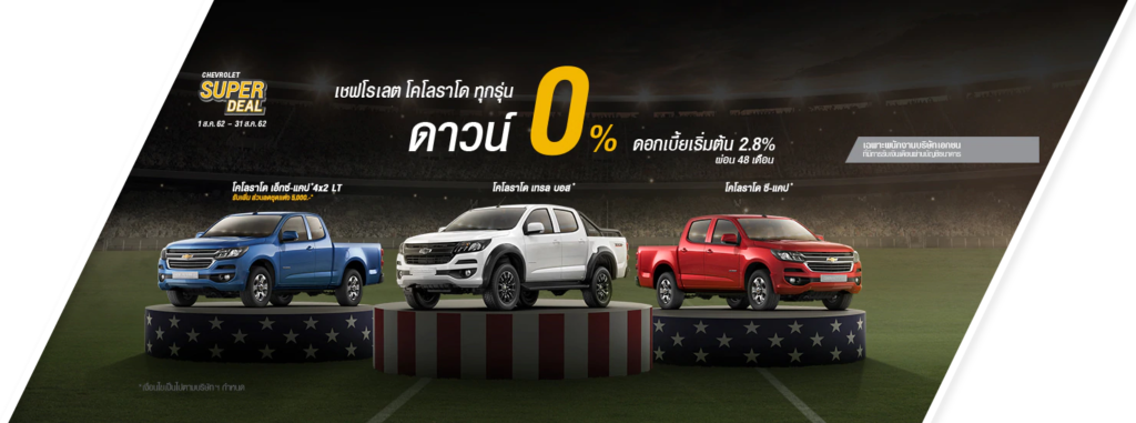 พบกับข้อเสนอพิเศษจากเชฟโรเลต ไม่ว่าจะเป็นกระบะโคโลราโด หรือ เทรลเบลเซอร์ SUV สไตล์อเมริกัน ที่โชว์รูมเชฟโรเลต ทั่วประเทศ ตั้งแต่ 1 สิงหาคม – 31 สิงหาคม 2562 โดยข้อเสนอในแต่ละรุ่นมีดังนี้