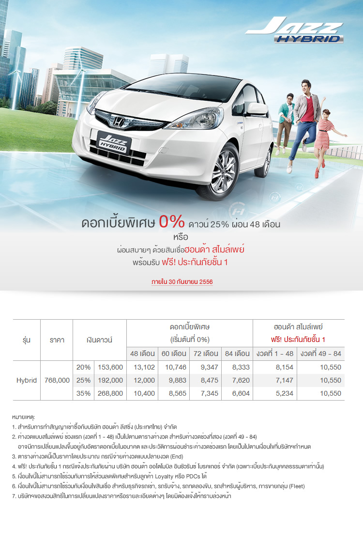 ออกรถยนต์ฮอนด้า แจ๊ส ไฮบริด (Honda Jazz Hybrid) วันนี้รับข้อเสนอพิเศษดอกเบี้ย 0% เมื่อดาวน์เริ่มต้น 25% ผ่อน 48 เดือน หรือผ่อนสบายๆด้วยสินเชื่อ สไมล์เพย์ พร้อมรับฟรี ประกันภัยชั้น 1 ภายใน 30 กันยายน 2556