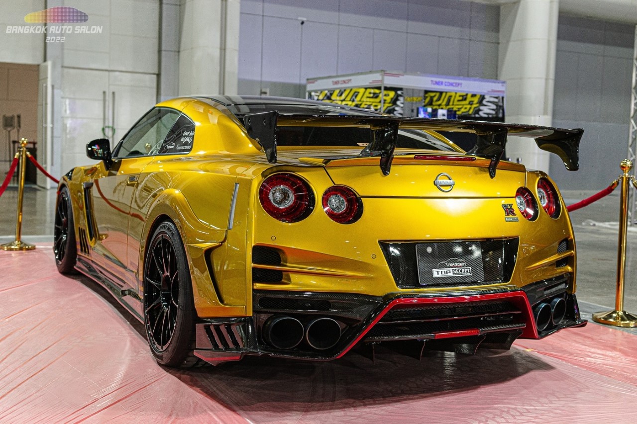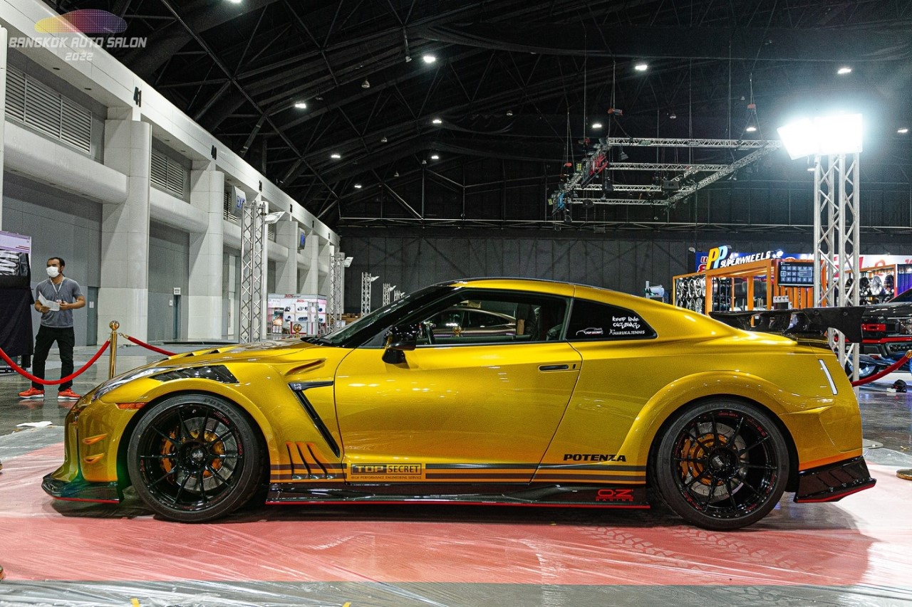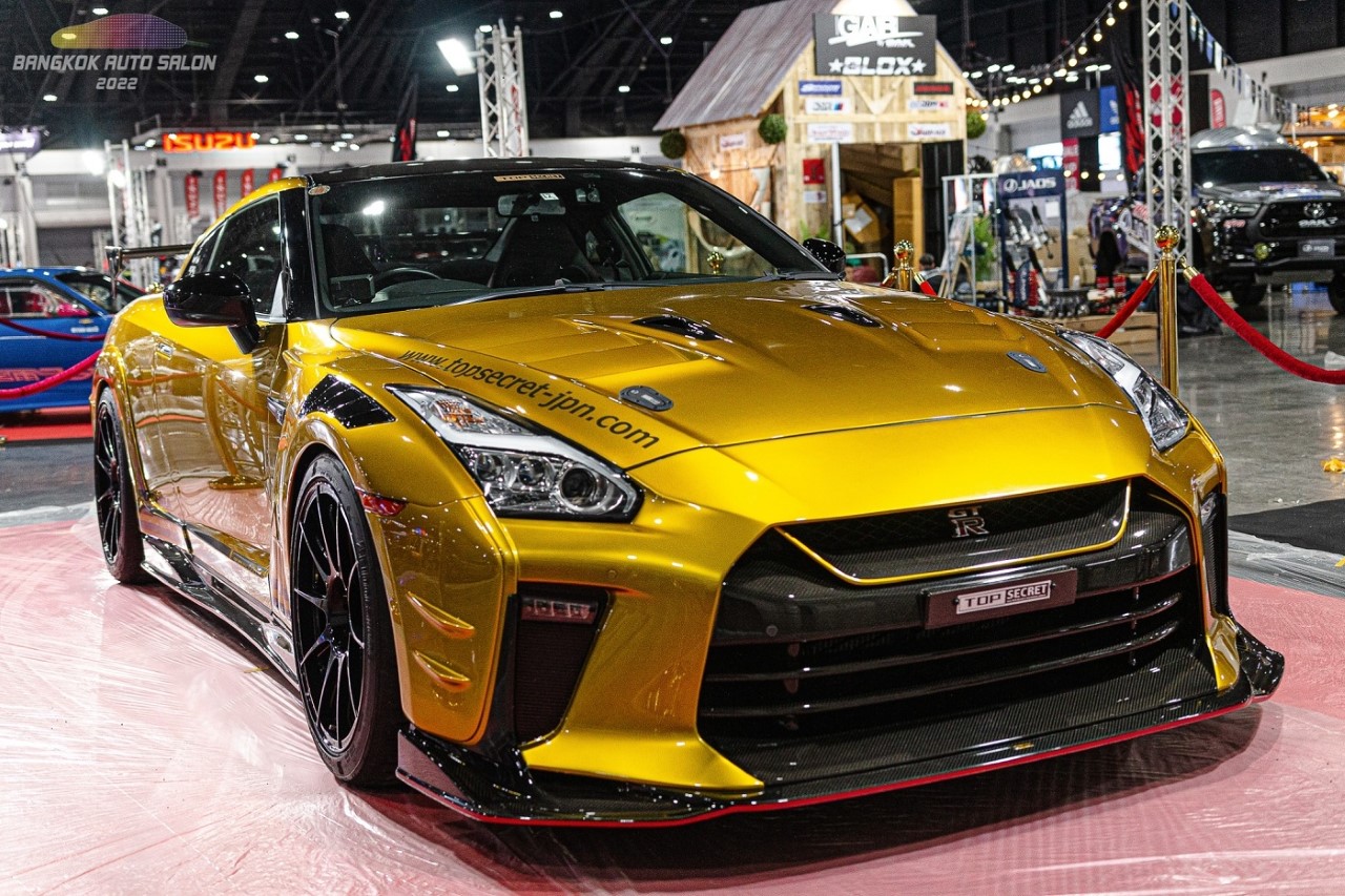 TOP SECRET NISSAN GTR R35 ใส่ชุดแต่งประจำสำนัก TOP SECRET และทำสีทองชื่อว่า TOP SECRET CANDY GOLD ซึ่งเป็นสีประจำสำนัก เครื่องเดิมๆที่ผ่านการปรับจูน ท่อไอเสียเต็มระบบไทเทเนียม ชุดแต่งเป็น TOP SECRET 2022 และชุดแต่ง M17 Body parts ช่วงล่างได้ผ่านการปรับจูนจากสำนัก TOP SECRET ด้าน ล้อ เป็นล้อขอบ 20 ของ OZ รุ่น NEW Futura TOP SECRET รัดด้วยยาง Bridgestone Potenza RE71RS