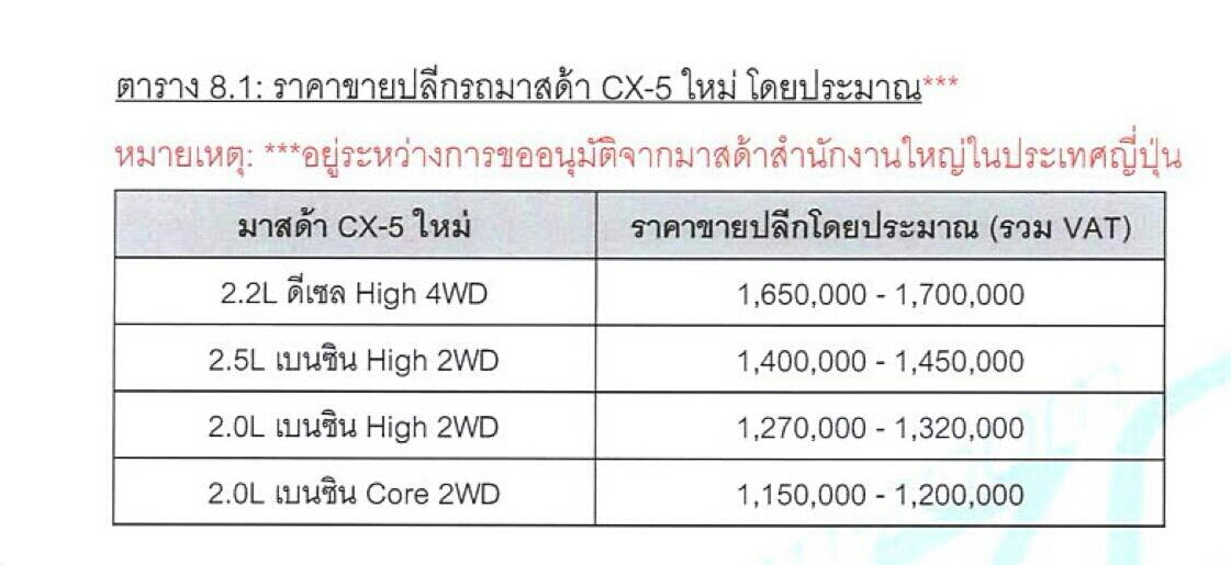 4. ดีเซล 2.2 skyactiv 173 แรงม้า @4,500 แรงบิด 420 n/m @ 2,000 ขับ 4 ไฟซีนอล ล้อ 19 ประมาณ 1,650,000