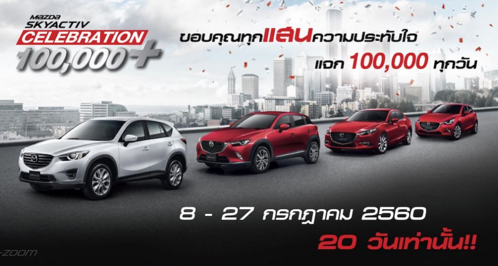 มาสด้าขอขอบคุณทุกแสนความประทับใจจากผู้ใช้ยนตรกรรมสกายแอคทีฟกว่าแสนคัน เพียงจองรถมาสด้าทุกรุ่นที่ร่วมรายการ ระหว่างวันที่ 8 –27 กรกฎาคมนี้ ลุ้นบัตรกำนัลมูลค่า 100,000 บาททุกวัน 20 รางวัล รวมมูลค่ากว่า 2,000,000 บาท ที่โชว์รูมมาสด้าทั่วประเทศ
