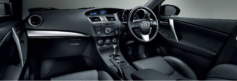 - ภายในของมาสด้า 3 ใหม่ปี 2013 ได้ถูกออกแบบมาเพื่อให้คนขับเป็นศูนย์กลางควบคุมทุกฟังก์ชั่นอย่างง่ายและสะดวก คอนโซลหน้ามีการออกแบบดีไซน์ใหม่ให้โค้งมน ไร้รอยต่า สไตล์โซนนิ่ง แผงมาตรวัดและหน้าจอแสดงข้อมูลที่จำเป็นต่อการขับขี่ ทุกฟังก์ชั่นได้ถูกจัดวางให้อยู่ในตำแหน่งที่ผู้ขับไม่ต้องละสายตาจากถนน และถ่ายทอดอารมณ์ความหรูด้วยเบาะหนังแท้สไตล์สปอร์ต