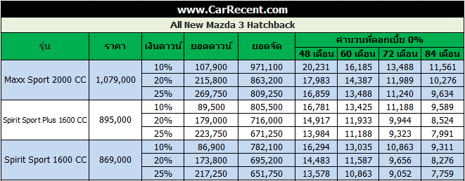 ตารางผ่อน-ดาวน์ All New Mazda 3 Hatchback