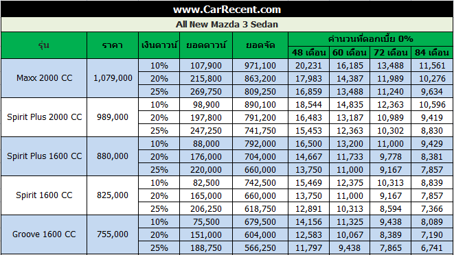 ตารางผ่อน-ดาวน์ All New Mazda 3 Sedan