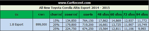 ตารางผ่อน – ดาวน์ All New Toyota Corolla Altis ESport 2014 ใหม่