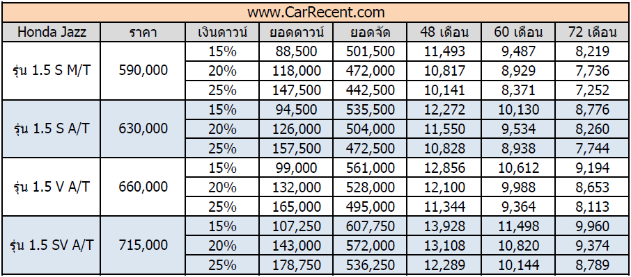 ตารางราคาผ่อน-ดาวน์ Honda Jazz ฮอนด้า แจ๊ส และ Honda jazz Hybrid