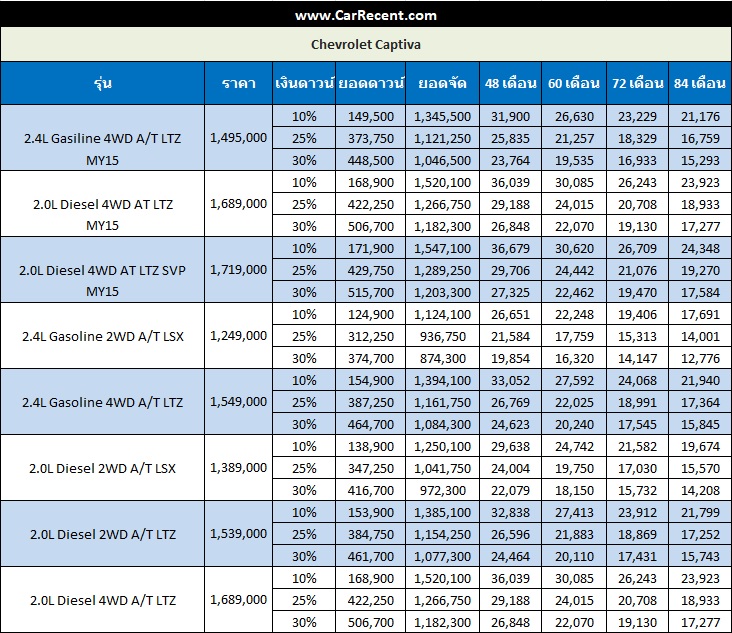 เชฟโรเลต แคปติวา (Chevrolet Captiva) เป็นรถยนต์อเนกประสงค์ประเภท SUV 7 ที่นั่ง ที่มีการจำหน่ายแลพัฒนาในประเทศไทยมาหลายปีแล้ว เป็นรถที่ตอบโจทย์ชีวิตคนเมือง ไม่ว่าจะวัยทำงาน ท่องเที่ยว หรือชอปปิ้ง มีความคล่องตัวไม่ว่าจะในเมืองหรือต่างจังหวัด ณ ปัจจุบันมีจำหน่ายด้วยกัน 8 รุ่นย่อย มีราคาในแต่ละร่นย่อยดังนี้