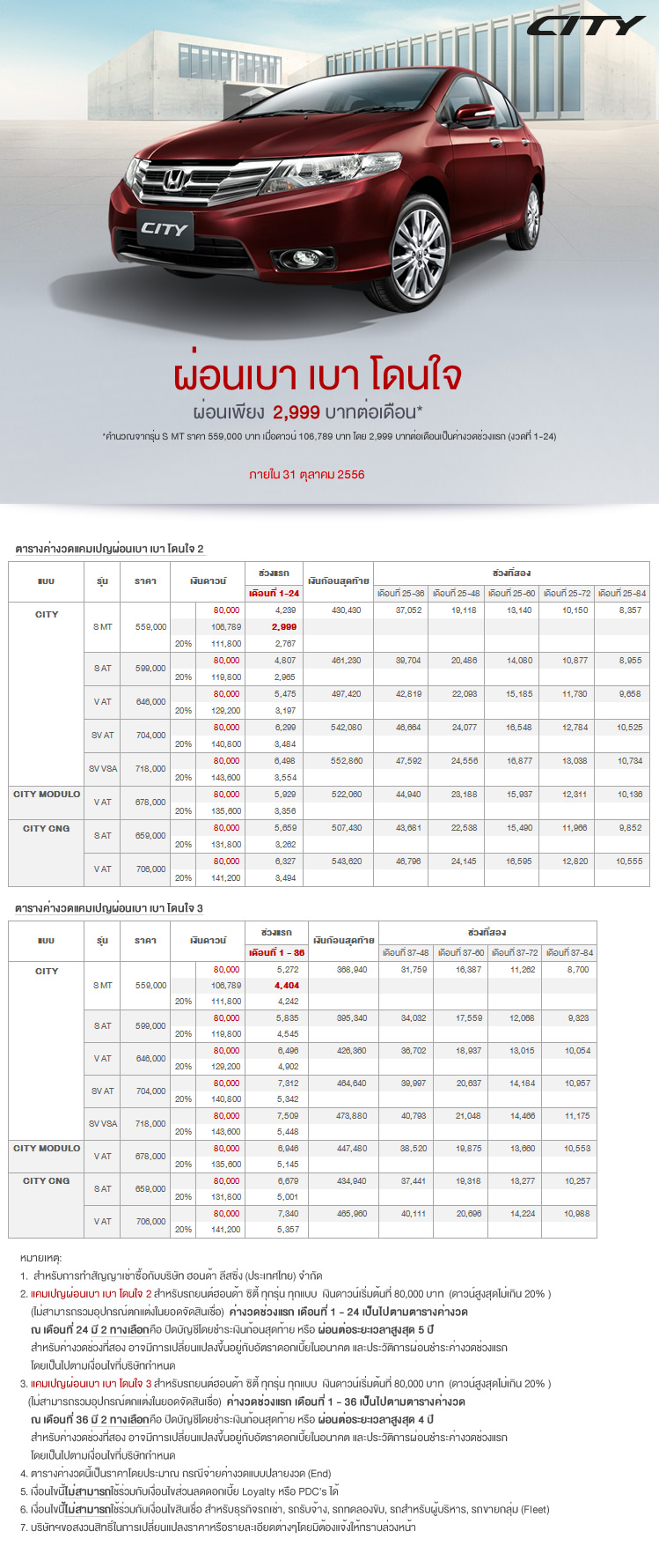 เอาไปเลยสำหรับลูกค้าที่ออกรถฮอนด้าซิตี้ (Honda City) วันนี้สามารถเลือกรับข้อเสนอพิเศษโปรโมชั่น ผ่อน เบา เบา โดนใจ ผ่อนเพียง 2,999 บาทต่อเดือน โดยโปรโมชั่นนี้มีระยะเวลาตั้งแต่วันนี้ถึง 31 ตุลาคม 2556 นี้เท่านั้นนะครับ
