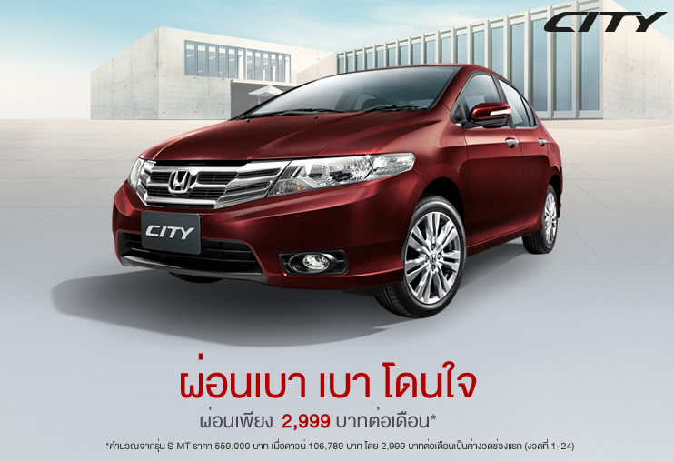 3. แคมเปญผ่อนเบาๆ โดนใจ 3 สำหรับรถยนต์ฮอนด้า ซิตี้ ทุกรุ่นทุกแบบ เงินดาวน์เริ่มต้นที่ 80,000 บาท (ดาวน์สูงสุดไม่เกิน 20%) (ไม่สามารถรวมอุปกรณ์ตกแต่งในยอดจัดสินเชื่อ) ค่างวดช่วงแรก เดือนที่ 1 – 36 เป็นไปตามตารางค่างวด ณ เดือนที่ 36 มี 2 ทางเลือก คือ ปิดบัญชีโดยชำระเงินก้อนสุดท้าย หรือผ่อนต่อระยะเวลาสูงสุด 4 ปี สำหรับค่างวดช่วงที่สอง อาจมีการเปลี่ยนแปลงขึ้นอยู่กับอัตราดอกเบี้ยในอนาคต และประวัติการผ่อนชำระค่างวดช่วงแรกโดยเป็นไปตามเงื่อนไขที่บริษัทกำหนด