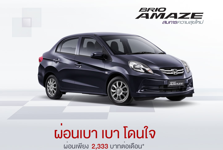 - แคมเปญผ่อนเบา เบา โดนใจ (24 เดือน) สำหรับรถยนต์ฮอนด้า บริโอ้ อเมซ ทุกรุ่น ทุกแบบ เงินดาวน์เริ่มต้นที่ 80,000 บาท (เงินดาวน์สูงสุด 20%) (ไม่สามารถรวมอุปกรณ์ตกแต่งในยอดจัดสินเชื่อ) ค่างวดช่วงแรก เดือนที 1 – 24 เป็นไปตามตารางค่างวด ณ เดือนที่ 24 มี 2 ทางเลือกคือ ปิดบัญชีโดยชำระเงินก้อนสุดท้าย หรือ ผ่านต่อระยะเวลาสูงสุด 5 ปี สำหรับค่างวดช่วงที่สอง อาจมีการเปลี่ยนแปลงขึ้นอยู่กับอัตราดอกเบี้ยในอนาคตและประวัติการผ่อนชำระค่างวดช่วงแรกโดยเป็นไปตามเงื่อนไขที่บริษัทกำหนด