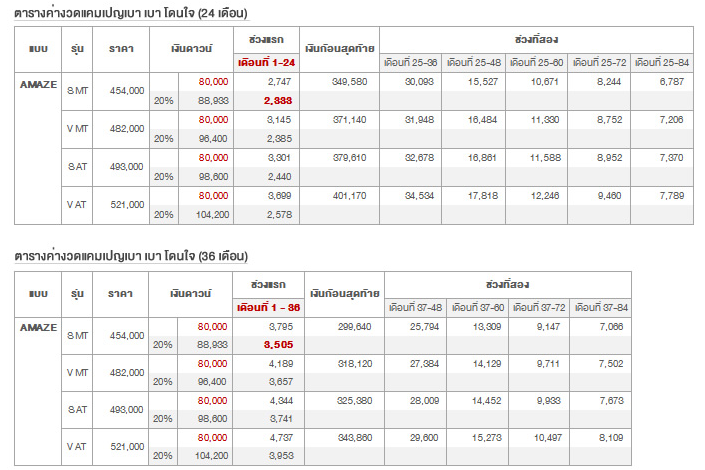 - เคมเปญผ่อนเบา เบา โดนใจ 36 (เดือน) สำหรับรถยนต์ฮอนด้า บริโอ้ อเมซ ทุกรุ่น ทุกแบบ เงินดาวน์เริ่มต้นที่ 80,000 บาท (ดาวน์สูงสุดไม่เกิน 20%) (ไม่สามารถรวมอุปกรณ์ตกแต่งในยอดจัดสินเชื้อ) ค่างวดช่วงแรก เคือนที่ 1 – 38 เป็นไปตามตารางค่างวด ณ เดือนที่ 36 มี 2 ทางเลือกคือ ปิดบัญชีโดยชำระเงินก้อนสุดท้าย หรือ ผ่อนต่อระยะเวลาสูงสุด 4 ปี สำหรับค่างวดช่วงที่สอง อาจมีการเปลี่ยนแปลงขึ้นอยู่กับอัตราดอกเบี้ยในอนาคต และประวัติการผ่อนชำระค่างวดช่วงแรกโดยเป็นไปตามเงื่อนไขที่บริษัทกำหนด