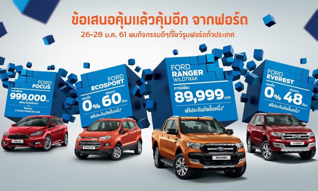 ต้นปีโปรโมชั่นดีๆก็ยังมีอยู่ในการออกรถ Ford ทุกรุ่น ข้อเสนอคุ้มแล้วคุ้มอีก มีทั้งดอกเบี้ยต่ำ ดาวน์ถูก ฟรีประกันภัยชั้นหนึ่ง โดยเฉพาะวันที่ 28-29 มกราคม พ.ศ. 2561 จะมีการจัดกิจกรรมดีๆ ที่โชว์รูมฟอร์ดทุกสาขา ส่วนรายละเอียดของข้อเสนอในแต่ละรุ่นมีดังนี้