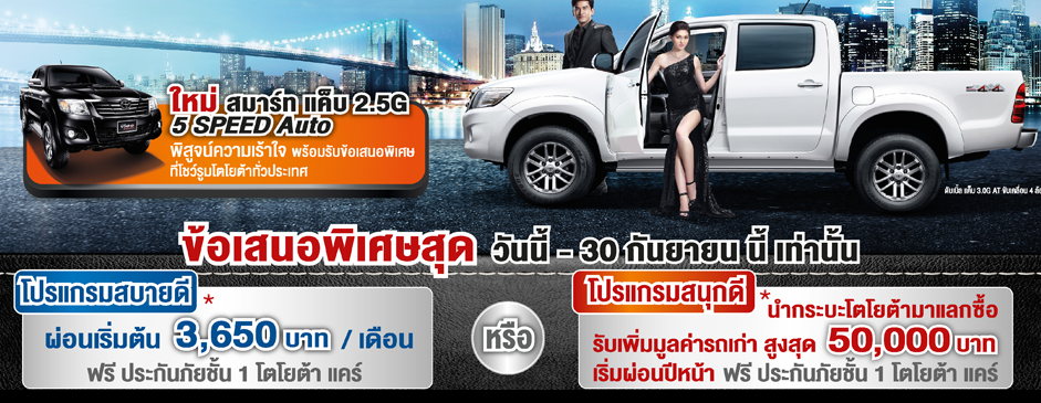 - โปรแกรมสนุกดี :: พิเศษสำหรับลูกค้าปัจจุบันของ Hilux Vigo นำรถเก่ามาแลกใหม่ รับเพิ่มมูลค่าสูงสุด 50,000 บาท พร้อมสิทธิ์เริ่มต้นผ่อนปีหน้า สำหรับลูกค้าที่เช่าซื้อและผ่านการอนุมัติจากบริษัท โตโยต้า ลีสซิ่ง (ประเทศไทย) จำกัด เท่านั้น โดยลูกค้าเริ่มชำระงวดแรกวันที่ 6 ม.ค. 57 ดาวน์เริ่มต้น 15% และต้องการผู้คํ้าประกันในการพิจารณาสินเชื่อร่วมกับผู้เช่าซื้อ