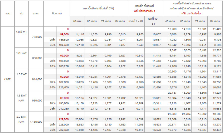 - พิเศษ!! สำหรับลูกค้ากลุ่มข้าราชการ พนักงานรัฐวิสาหกิจ และกลุ่มอาชีพพิเศษ สามารถ ดาวน์ 0% พร้อมรับฟรีประกันภัยชั้นหนึ่งผ่อนนานสูงสุด 84 เดือน