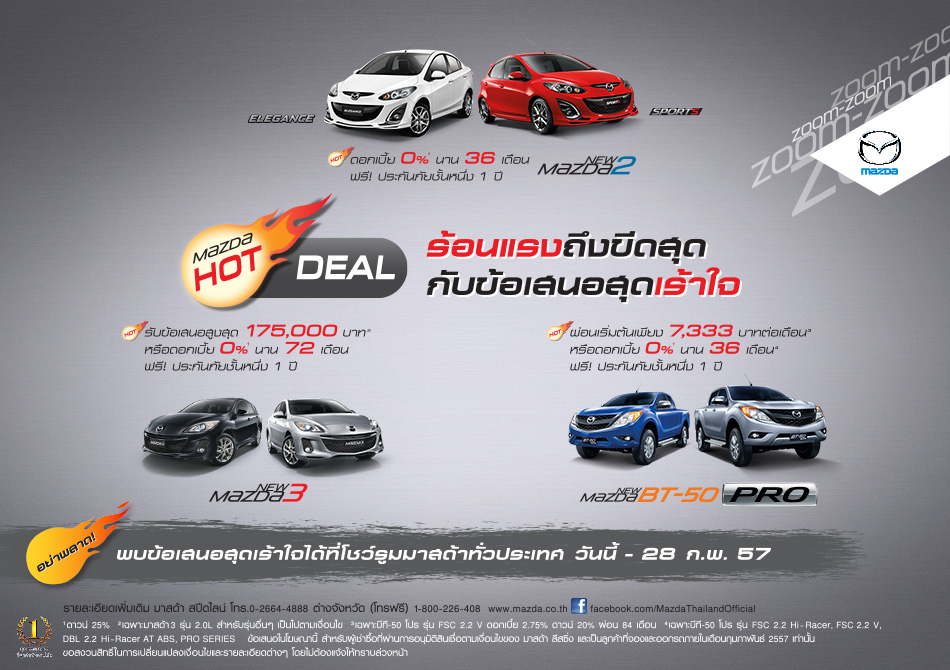 มา Zoom Zoom กับโปรโมชันมาสด้า ร้อนแรงถึงขีดสุดกับข้อเสนอสุดเร้าใจ ด้วยกัน 3 รุ่นด้วยกันนั่นก็คือ Mazda 2, Mazda 3, และ Mazda BT-50 Pro โดยโปรโมชั่นข้อเสนอนี้สามารถติดต่อสอบถามได้ที่โชว์รูมทั่วประเทศ ตั้งแต่วันนี้ถึง 28 ก.พ. 2557