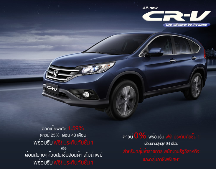 Honda เป็นอีกหนึ่งค่ายใหญ่ที่เอาใจลูกค้าด้วยการจัดโปรโมชั่นให้กับรถยนต์หลายรุ่นด้วยกันในช่วงปลายปีนี้ รวมถึงงาน Motor Expo 2013 ด้วย All New Honda CR-V ก็เป็นอีกหนึ่งรุ่นที่ทางฮอนด้าได้จัดโปรโมชั่นดีให้กับลูกค้า มาดูรายละเอียดแคมเปญและข้อเสนอที่ทางฮอนด้าจัดให้กันครับว่าเป็นยังไงบ้าง