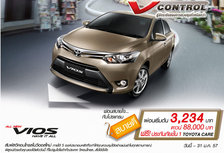ต้อนรับต้นปีโตโยต้า มอเตอร์ (ประเทศไทย) จำกัด จัดแคมเปญ – โปรโมชั่นรถยนต์นั่งยอดนิยม All New Vios 2014 ให้กับลูกค้าที่สนใจ โดยรายละเอียดมีดังต่อไปนี้