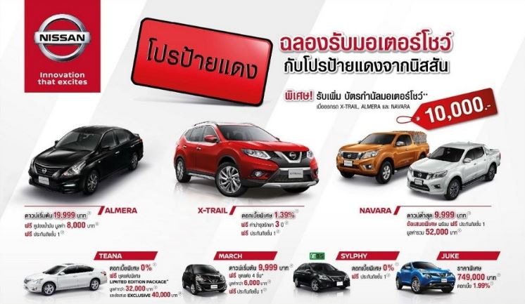 นิสสัน เป็นยี่ห้อหนึ่งที่อยู่กับคนไทยมาช้านาน ในงานนี้ทางนิสสันเองก็เตรียมโปรโมชั่นออกรถสุดคุ้ม โปรป้ายแดง ข้อเสนอสุดพิเศษมานำเสนอให้กับลูกค้าด้วยเช่นกัน มีรายละเอียดดังนี้