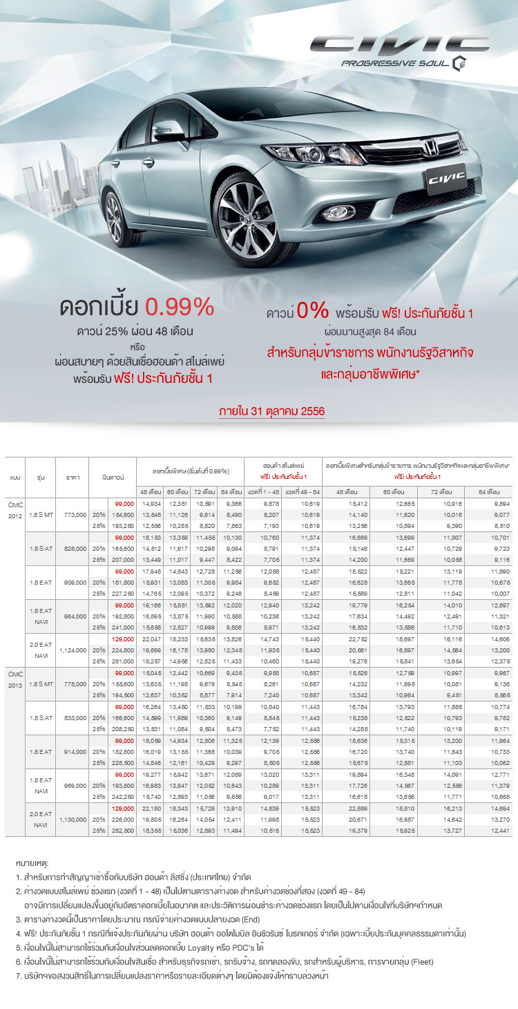 ช่วงนี้สำหรับตลาดยานยนต์ถือว่าแข่งกันเยอะพอสมควร วันนี้ถึงคราวรถยนต์ยอดนิยมอีกหนึ่งรุ่นนั่นก็คือ ฮอนด้า ซีวิค (Honda Civic) ครั้งนี้จัดโปรโมชั่นยาวไปถึง ปลายเดือนตุลาคม 2556 เลยทีเดียว มาดูรายละเอียดโปรโมชั่นนี้กันครับ